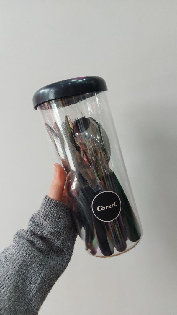Set de cubiertos que viene en contenedor de acrílico para reutilizar