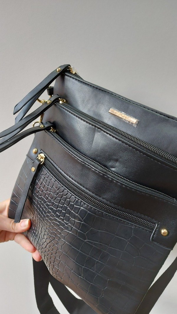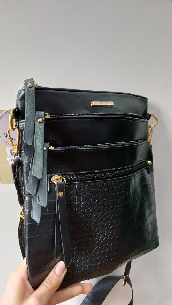 Carterita tipo morral con correa regulable y detalles en color dorado + crocco