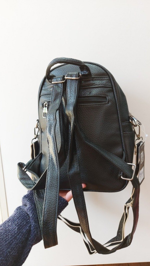 Es 2 en 1 porque podes usarla como mochila con sus tiras regulables, y tambien como cartera con su correa larga regulable tambien. Tiene 4 cierres y espacio para botella pequeña en el lateral.