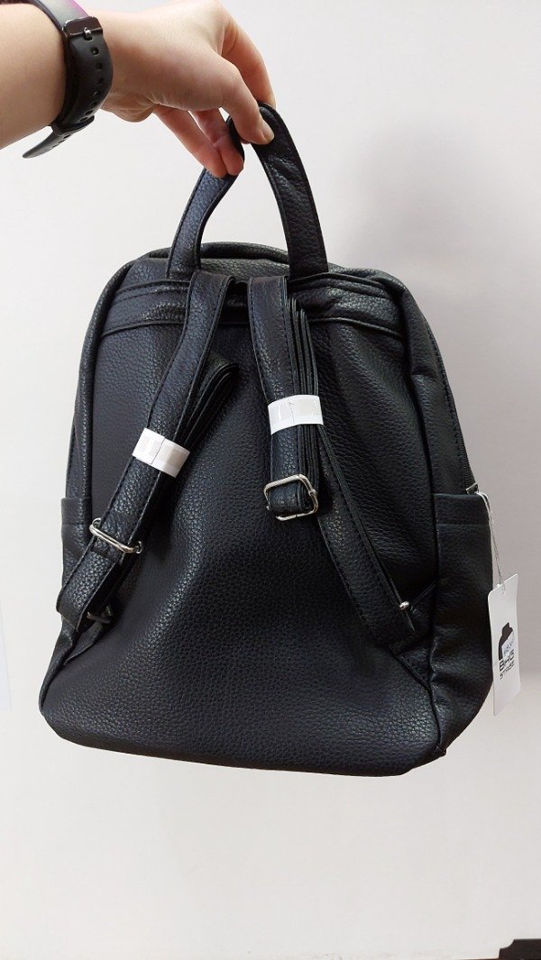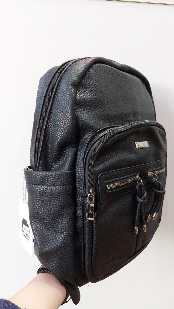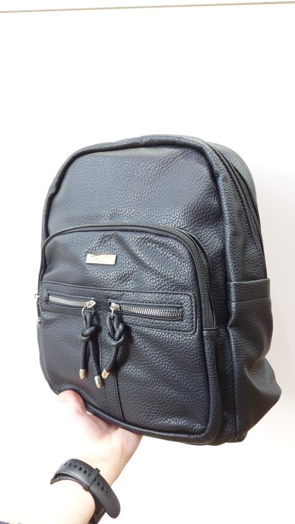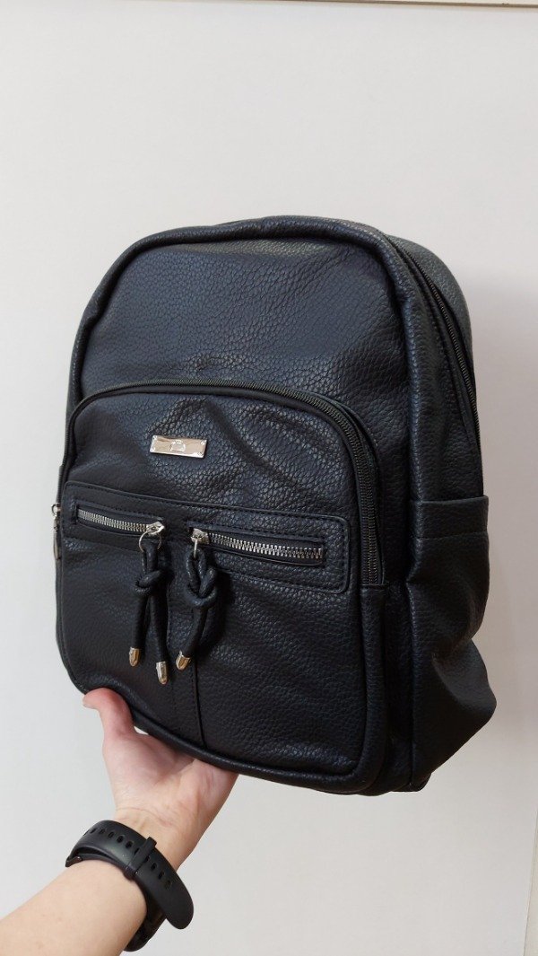 Mochila de ecocuero, muy espaciosa! Tiene tiras regulables, tiene 4 cierres en total (los dos de adelante son pequeñitos) y ademas espacio para botella en el lateral.