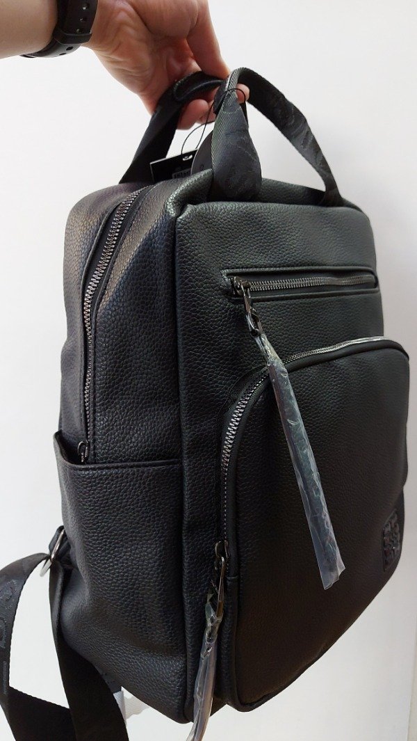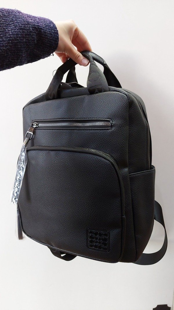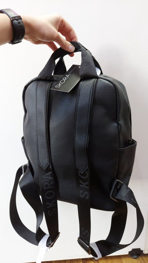 Mochila marca Skora, con forma cuadrada. Es de eco cuero, super canchera. Tiene tiras regulables y tambien manijitas superiores. Tiene 3 cierres y espacio para botella en el lateral.