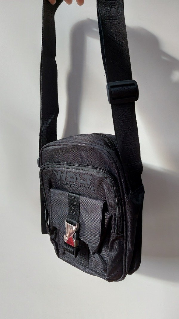Tiene correa regulable y cuenta con 3 compartimientos: dos con cierre y uno con broche