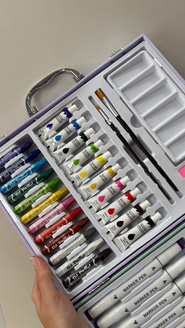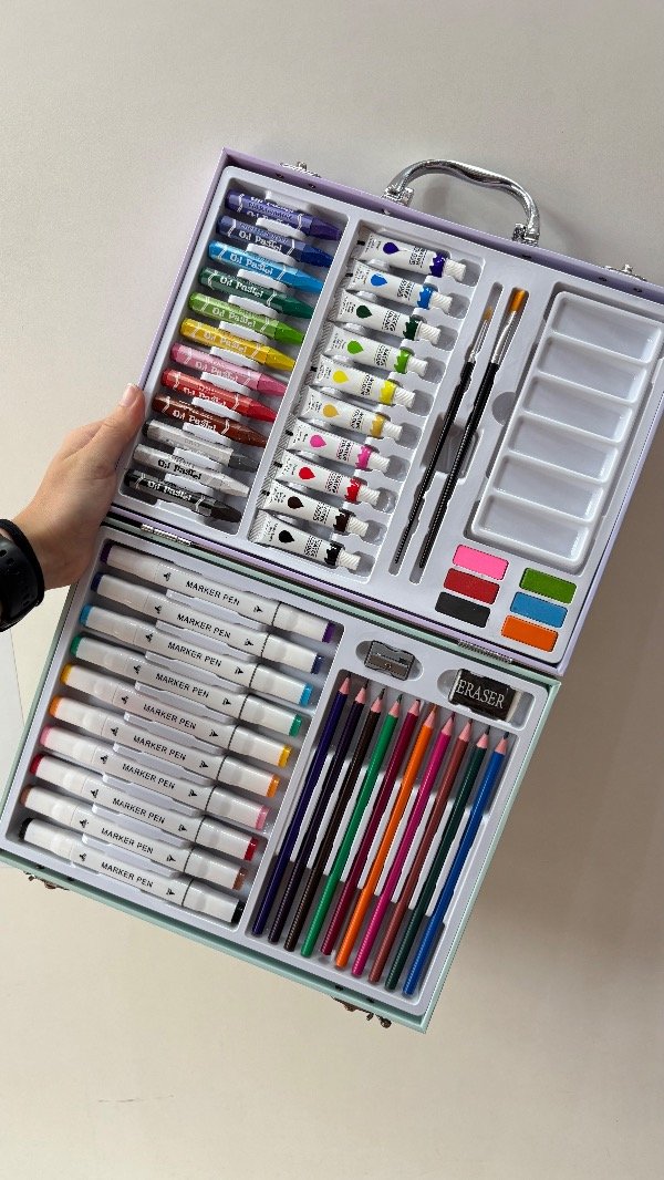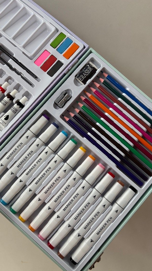 Incluye 52 piezas, para que no te falte nada a la hora de crear: Marcadores, Lápices, Crayones, Pinceles, acuarelas, goma de borrar, sacapuntas.
