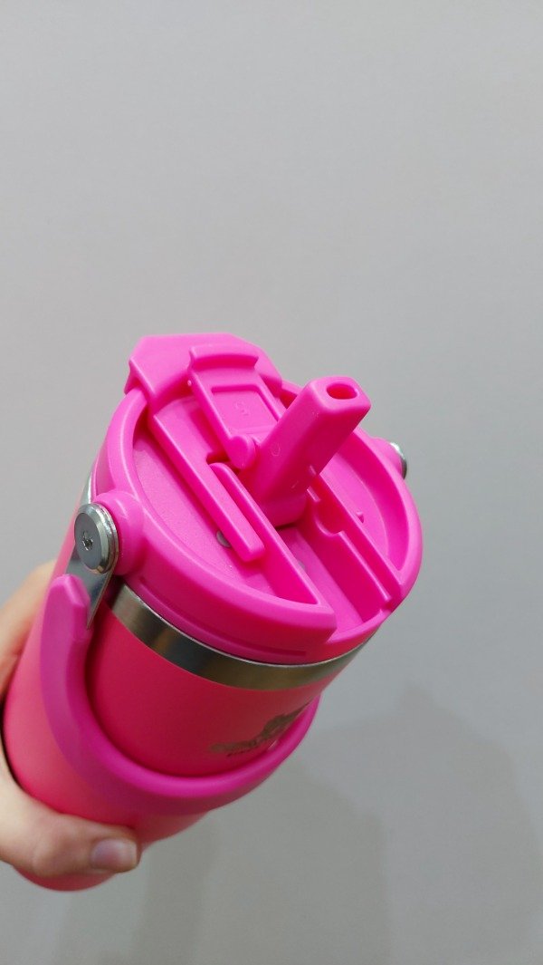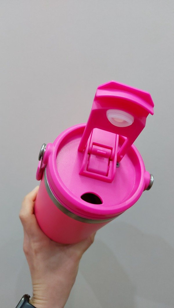 Con doble pico: uno es pico rebatible tipo flip straw y el otro es orificio (que obvio podes añadirme un sorbete o tomar directo asi).